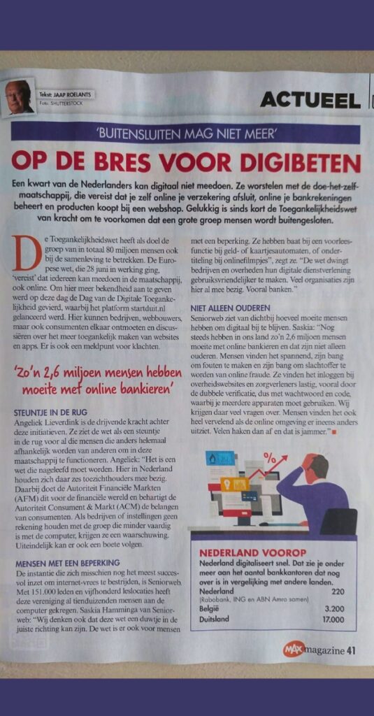 Angeliek: “Het is een wet die nageleefd moet worden. Hier in Nederland houden zich daar zes toezichthouders mee bezig. Daarbij doet de Autoriteit Financiële Markten (AFM) dit voor de financiële wereld en behartigt de Autoriteit Consument & Markt (ACM) de belangen van consumenten. Als bedrijven of instellingen geen rekening houden met de groep die minder vaardig is met de computer, krijgen ze een waarschuwing. Uiteindelijk kan er ook een boete volgen.”